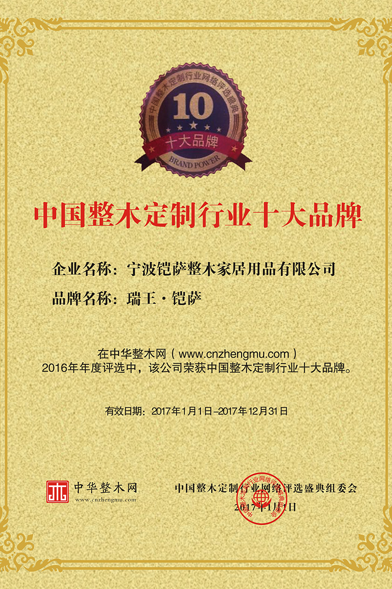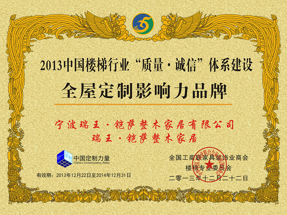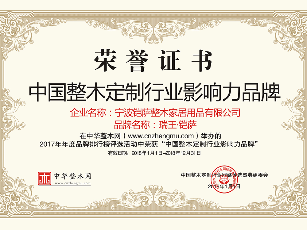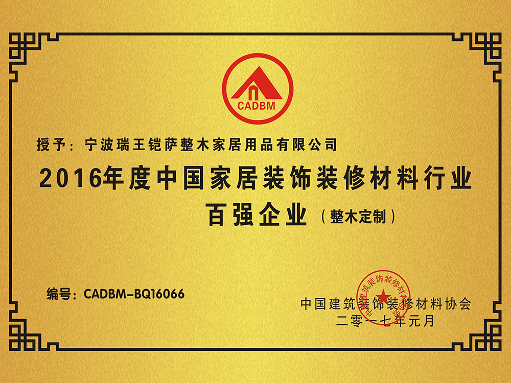 總部座落于浙江寧波,至今已有27年歷史,是我國樓梯行業的先驅企業。2009年,瑞王向原木定制行業邁進,前瞻性的以“瑞王·鎧薩”的品牌形象成功的把產業延 伸到了木門、護墻板、櫥柜、衣帽間、酒柜、書柜、吊頂等全原木定制領域,優化調整了研發、 設計、生產、檢測、施工程序,完善了管理體系和質量控制體系。同時,在2019年根據市場環 境和品牌形象,打造了極簡高端全屋定制品牌—瑞王·CARO,以簡潔而又具有設計感的家居形象,深入到人們日常生活當中。