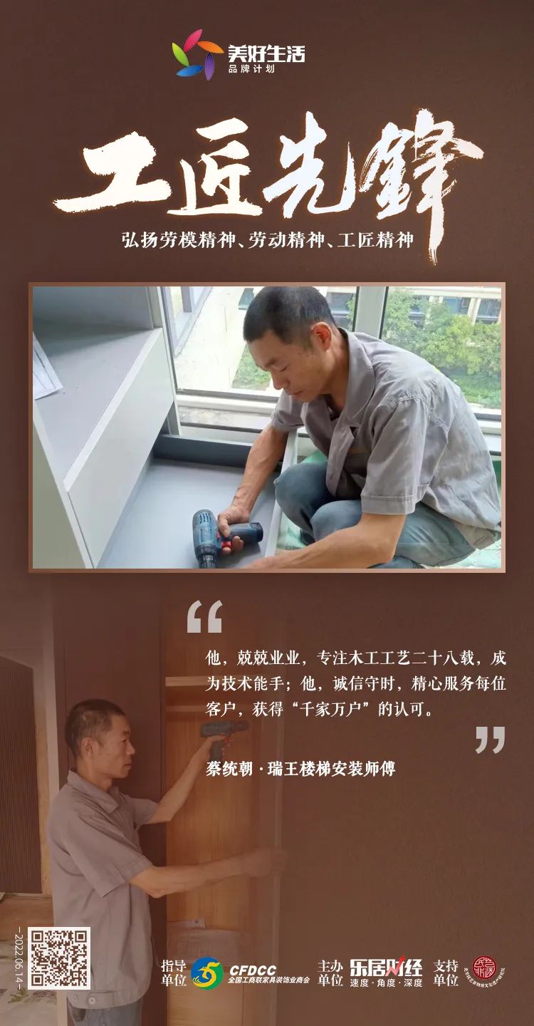 編者按:弘揚勞模精神、勞動精神、工匠精神。5月1日,由樂居財經主辦,全國工商聯家具裝飾業商會指導的“發現2022工匠先鋒”活動正式啟動,挖掘地產、家居和物業行業中平凡而堅韌的工匠人。本期工匠先鋒?:瑞王樓梯安裝師傅蔡統朝。